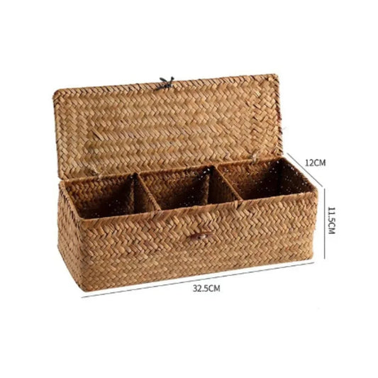 Panier de rangement en jacinthe de mer avec couvercle – 3 compartiments pour cuisine, salle de bain et maison